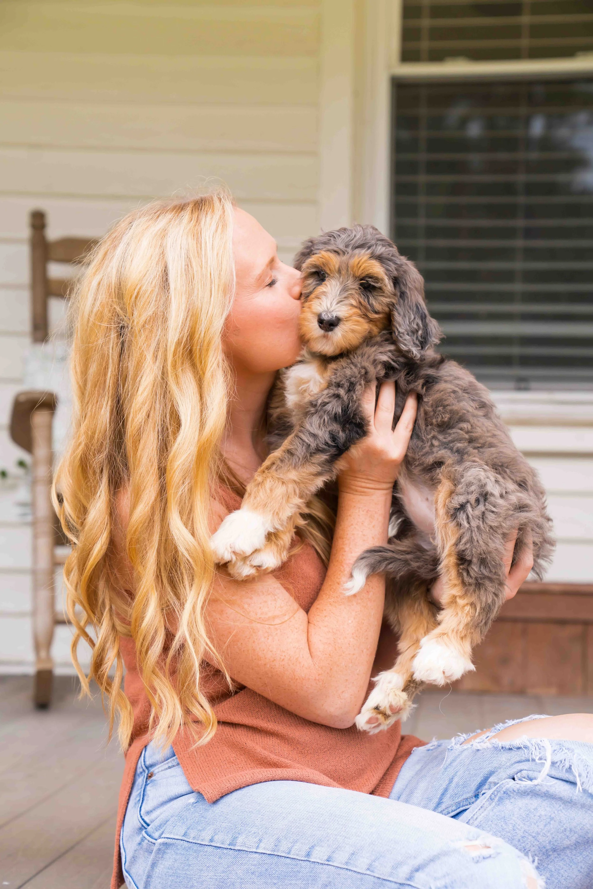 Haynes Wood is a beautiful chocolate merle bernedoodle and is a half brother to Dolly! His blue eyes capture your soul when you look at them! While he’s still very much so a growing boy, we anticipate his adult weight to be around 50 lbs. He’s the sweetest boy and lives with a guardian family who says he’s very smart, loyal, and wants to be with his people always! We co-own Haynes with our breeder bestie at Reece+Co Doodles in Marietta, Ga. Haynes is a future hopeful stud for our program pending health and OFA testing in late 2026.